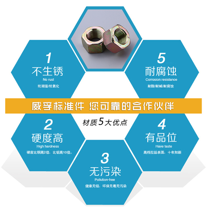 1、螺母就是螺帽,與螺栓或螺桿擰在一起用來起緊固作用的零件,所有生產制造機械必須用的一種元件根據材質的不同,分為碳鋼、不銹鋼、有色金屬(如銅)等幾大類型。依據屬性主要有國標( GB )德標( DIN )標準( ISO )日標(JIS)、美標( ASTM/ANSI)等標準。其中、國標、德標、日標用M表示(例如M8、M16),美制、英制則用分數或#表示規格(如8#、10#、 1/4、3/8 )。