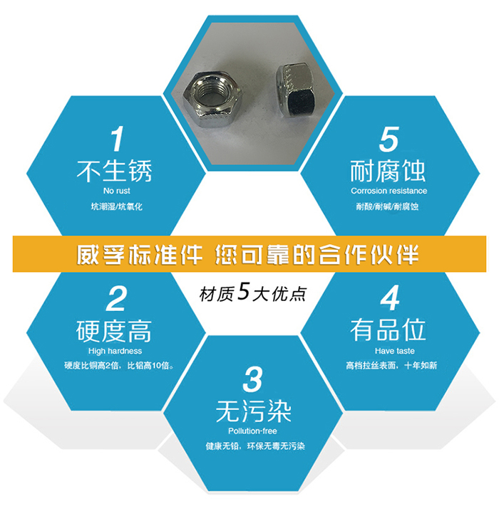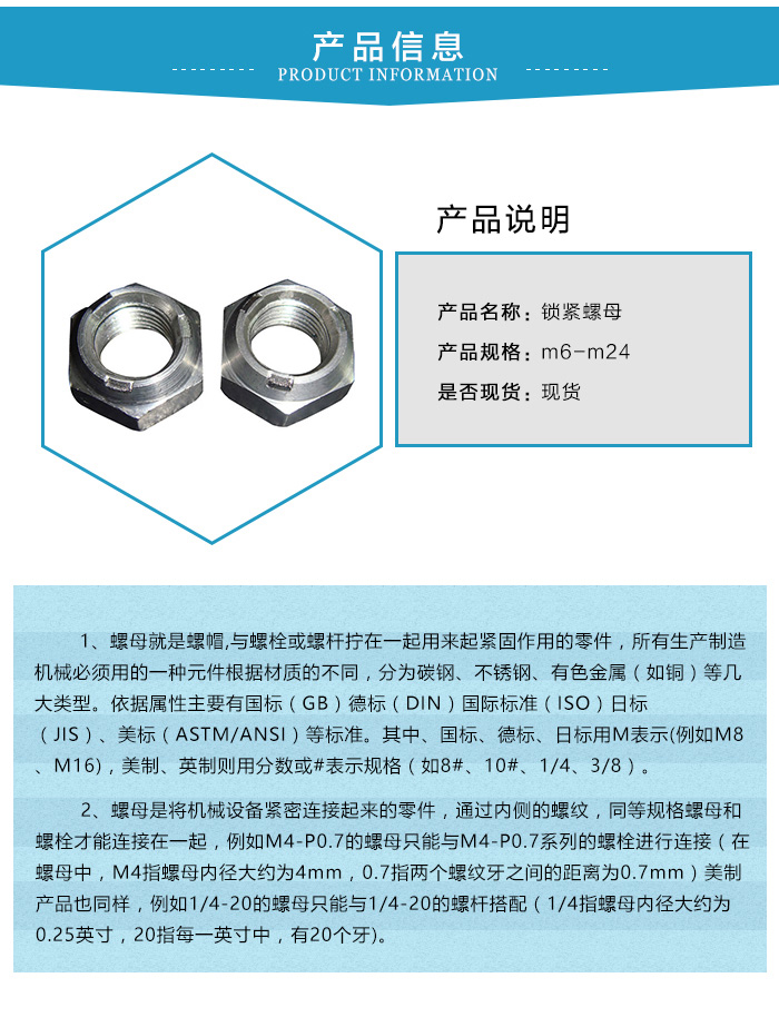 1、螺母就是螺帽,與螺栓或螺桿擰在一起用來起緊固作用的零件,所有生產制造機械必須用的一種元件根據材質的不同,分為碳鋼、不銹鋼、有色金屬(如銅)等幾大類型。依據屬性主要有國標( GB)德標( DIN )標準(ISO )日標( JIS)、美標( ASTM/ANSI )等標準。其中、國標、德標、日標用M表示(例如M8M16),美制、英制則用分數或#表示規格(如8#、10#、1/4、 3/8 )。