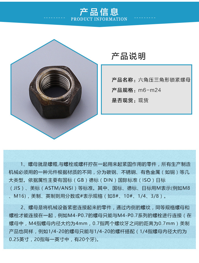六角壓三角形鎖緊螺母主要用于鎖緊通絲外接頭或其他管件時,六角壓三角形鎖緊螺母的防松效果優劣主要取決于螺母與螺栓嚙合螺紋之間相互作用力。提高嚙合螺紋之間相互作用力的方式有很多種,比如施必牢螺母的螺紋結構改良,尼龍螺母的尼龍增糙,螺紋的表面處理等。
