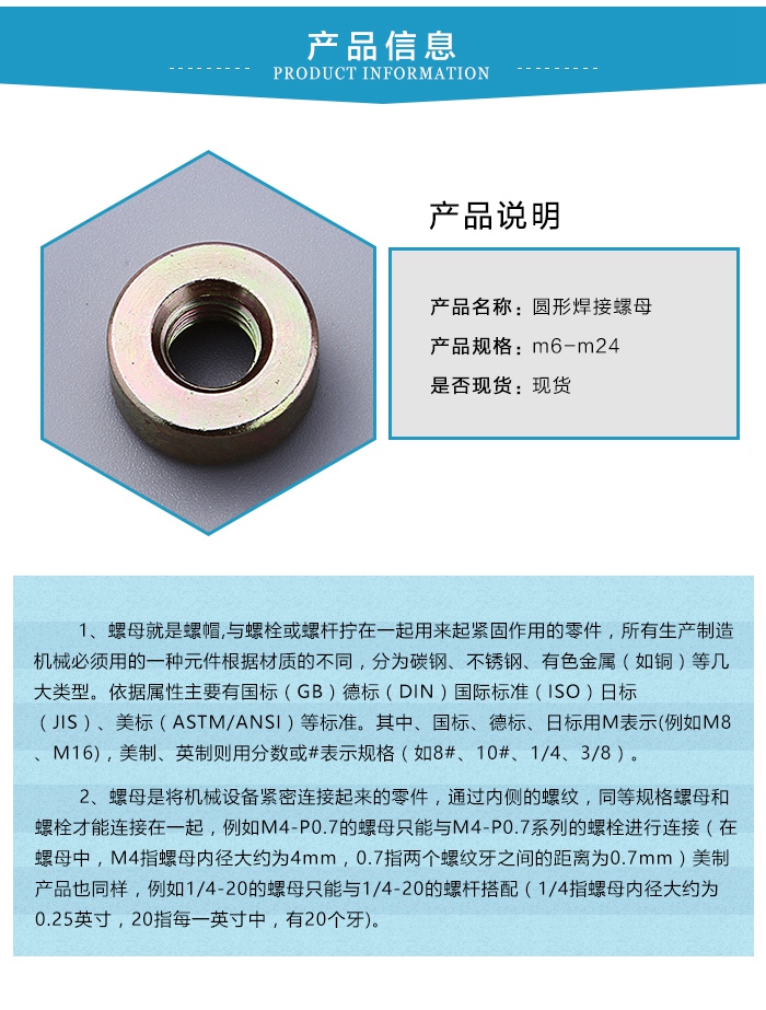 圓形焊接螺母被使用的范圍非常廣泛,是螺母中的一種,而且雖說焊接螺母的強(qiáng)度大,不易松脫,但在使用過程中還需要注意一些事項,以便焊接螺母連接使用。所謂焊接就是把兩個分離件變成一個整體,用高溫將金屬融化后混合到一起在冷卻,中間會加入合金,內(nèi)部是分子力的作用,要比一般母體輕度大。