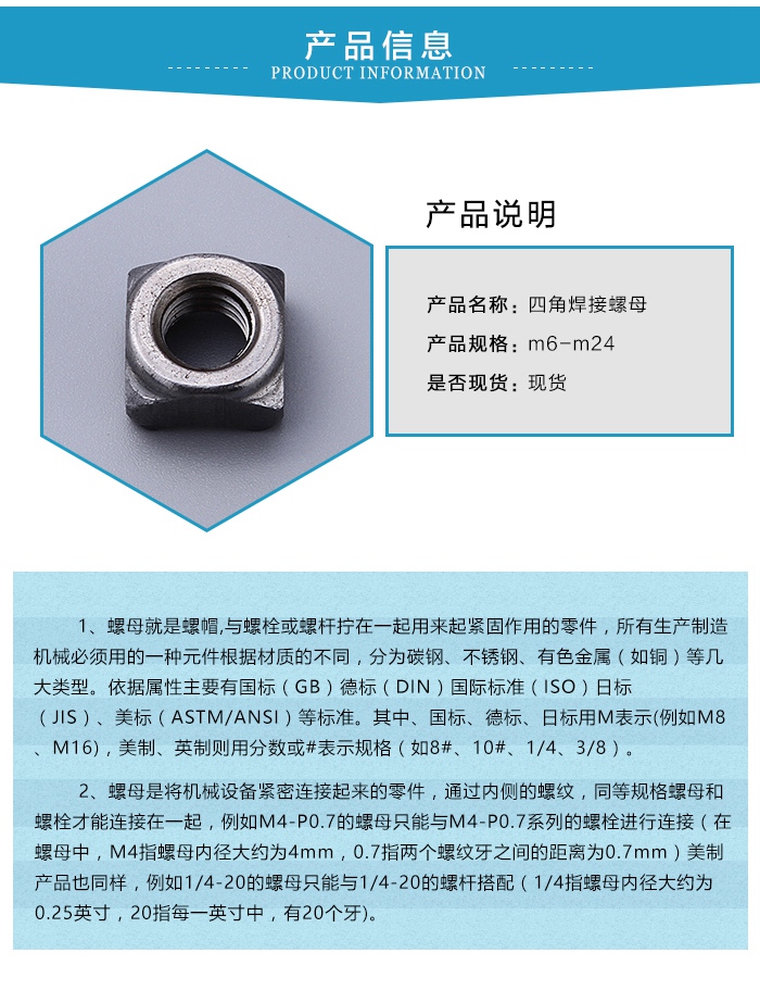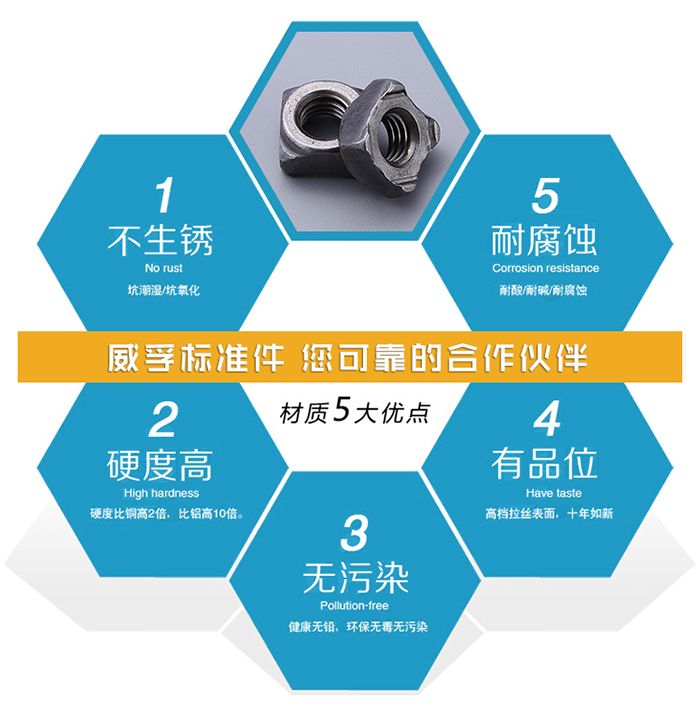 四角焊接螺母屬于焊接螺母中的一種,使用范圍廣,,強(qiáng)度比較大,且薄厚都可以,但是由于高溫會(huì)導(dǎo)致被連接件變形,且不可拆卸,而且一些活潑金屬不能用通常方法焊接,比如鋁,鎂等,需要保護(hù)氣或氬弧焊,要求加工工藝和精度。