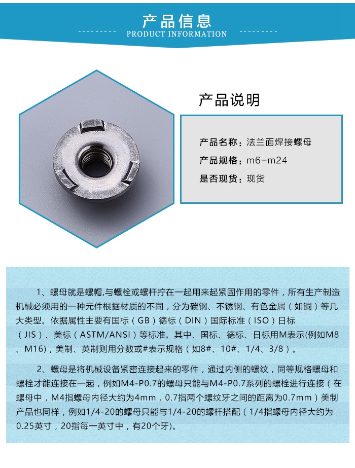 法蘭面焊接螺母是一種在螺母外適合焊接的螺母,一般是可焊接的材料制成的而且較厚適與焊接,焊接是相當于把兩個分離件變成一個整體,用高溫將金屬融化后混合到一起再冷卻,中間會加入合金,內部是分子力的作用,強度一般比母體強度大。