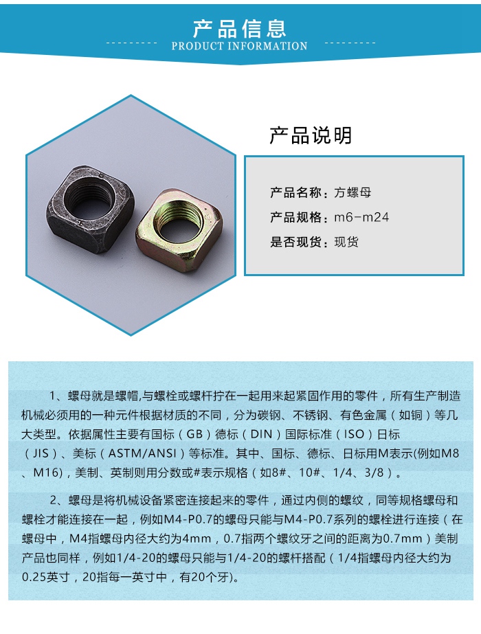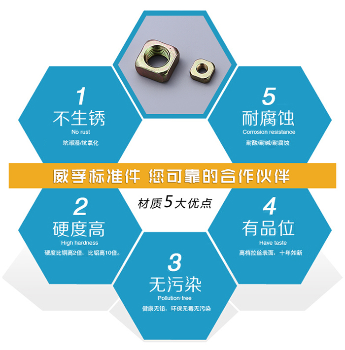 方螺母一般都是由各種金屬制作而成,我們日常見到的螺母則主要是由鐵或者是銅制作而成,由于鐵在潮濕的地方比較愛生銹,導電性能也不如銅,因此銅質的螺母經常被用于日常生活中。銅質的螺母不容易生銹、防腐蝕而且導電性能好,因此一般被人們經常應用于水龍頭、閥門或者是電器等防生銹、高溫導電等環境中使用。